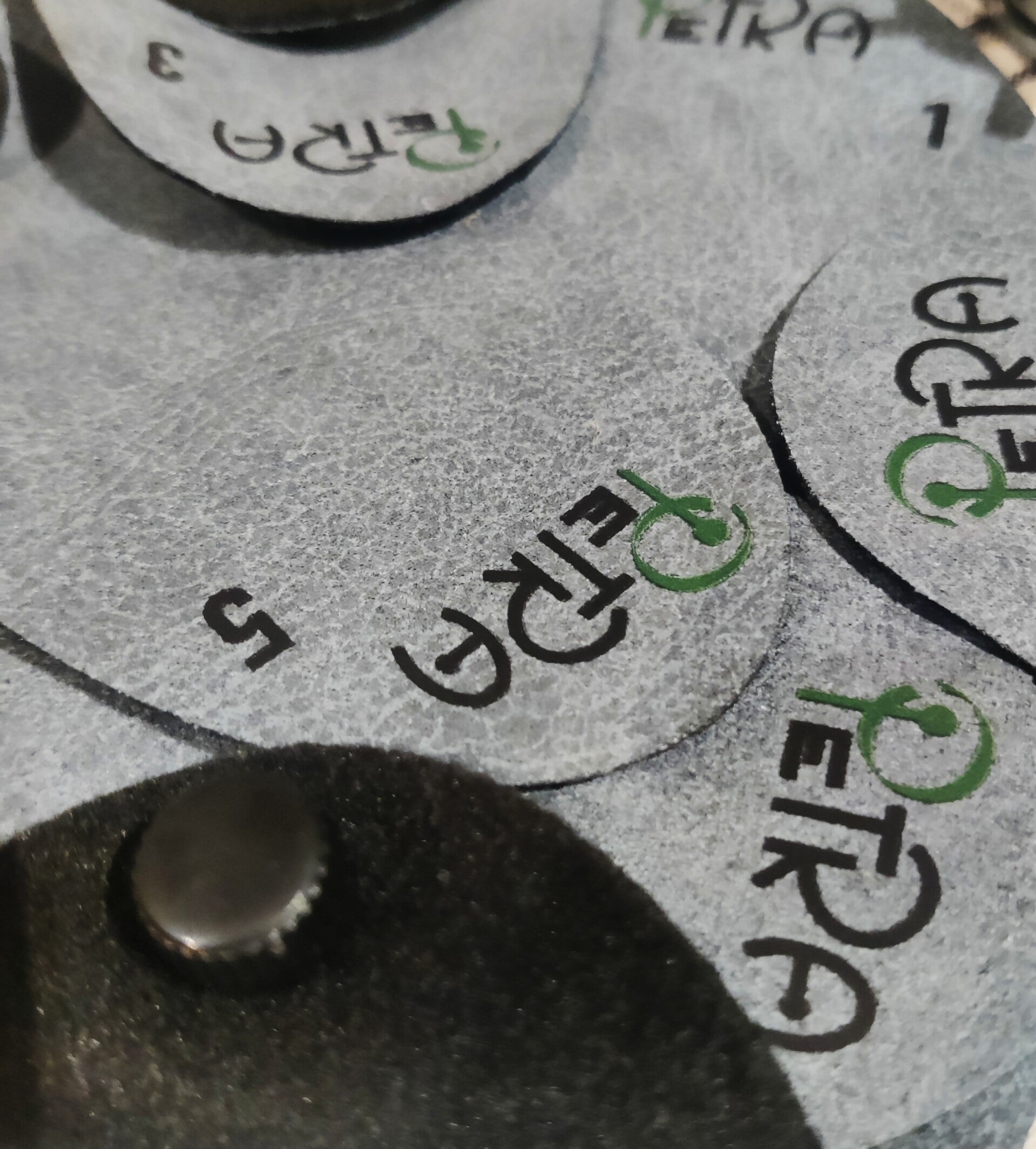 Set of 4 timpani mutes (from bigger to smaller). A magnet keeps the mute securely attached to the hoop, while a metal knob allows the player to quickly switch between on and off positions and adjust the amount of contact surface on the timpani head.